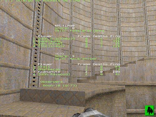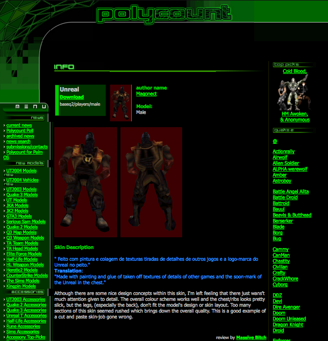 Bitch: O caso desse skin é o seguinte… o autor do modelo o fez em cima de um outro modeloque vem do próprio quake2 em missão singleplayer… a iron maiden ….ele criou belas tranformações em aranha no modelo original…bem legal…mas as skins….que coisa é aquela…cores chapadas e fluorescentes…muito horrível….na verdade o que eu fiz foi capturar o skin do personagem do jogo single e colar na nova estrutura de aranha……o nome do skin vem pelo fato do modelo ter sido feito sem o braço arma nem outros artefatos mecânicos..lembrando a utilização do skin no fim do jogo….quando as “bitchs” estão com o todo poderoso e derrotado chefão dos monstrengos do quake2.