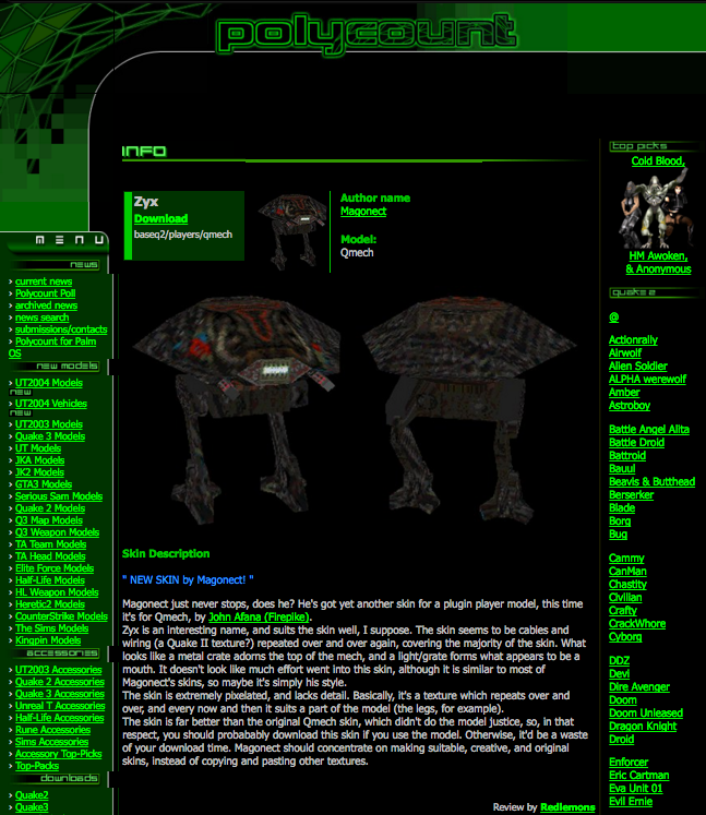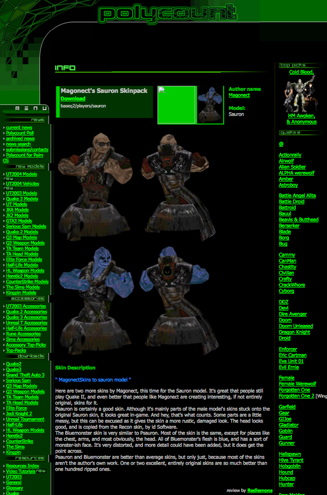 [note from Donde: Magonect did an incredible job preserving all of his great Quake 2 material. Magonect utilized many different websites to host the content: recovering what you are seeing in this post was like a treasure hunt crossed with a ten thousand piece puzzle, in a good way. That’s why I did not post individual links for each skin. However in most cases Magonect’s .zip files of skins, sound files and maps can be found by indexing the first link below. If the .zip you want happens not to be in that index, please try the second two links. Thank you Magonect for creating, sharing and helping to archive all of your awesome Quake 2 content.]