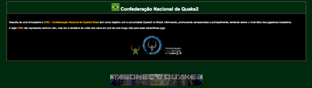 Nascida de uma brincadeira a CNQ – Confederação Nacional de Quake2 Brasil tem como objetivo unir a comunidade Quake2 no Brasil, informando, promovendo campeonatos e principalmente, tentando elevar o nível ético dos jogadores brasileiros.