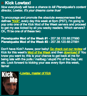 Kick is Planetquake’s mod of the week! You can now play Kick on PQ’s motw server and beat up Lowtax while your at it. I also updated the servers.txt that lists the Kick servers available.