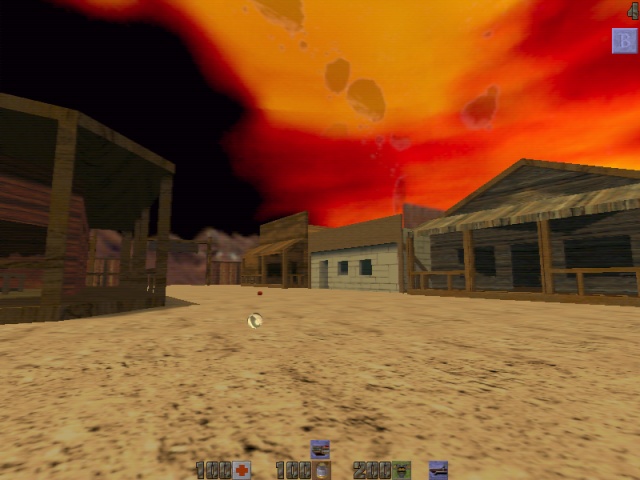Well, I spent the last two days making a unique map for Kick, and here it is! It’s an old western themed map named Wild Wild Kick. You’ll need a fast computer for this map since it’s heavy on the polygons. I have two different links available for download. One is with high res textures for people with the fast 16+mb 3d cards. The other is with low res textures for people who have old voodoo2’s or something like that. Here’s a screenshot.