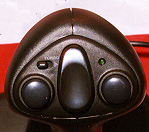 Overall the joystick stands about 10 inches tall and sits on a large thick 7.75 x 7.75 square base. The unit is all black except for the four red buttons and a somewhat tacky looking metallic label which has the Thrustmaster X-Fighter logo printed on it. There is a 4 position hat switch at the top-rear of the yoke and there are some very nice checkered neoprene inserts molded into the sides of the handle.