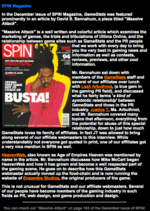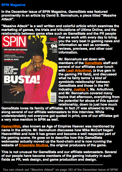 I have also recently been charged with managing most of the GameStats contacts with developers, publishers, and press/public relations people who are interested in either exposure on GameStats or in having their products reviewed or previewed. I also regularly set up numerous contests and special features, facilitate beta tests, and assign previews and reviews to our staff. I guess you could say I generally act as a funnel/dispersion point for both products and information related to any site activities, outside news, or contacts. This is probably the most interesting and most challenging part of my work. Oh and I even allow myself the opportunity to personally write reviews now and again.