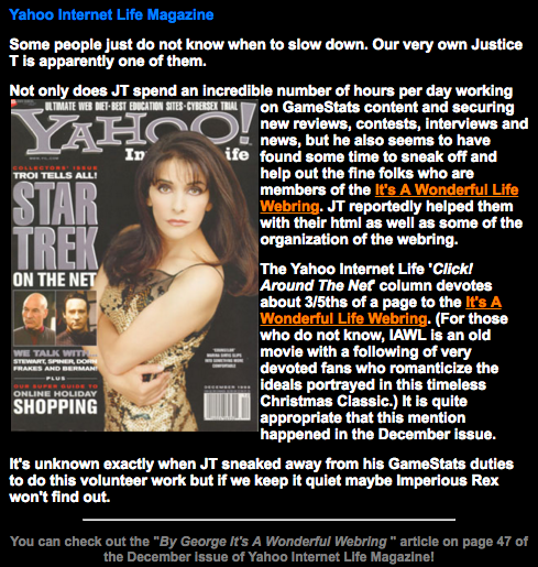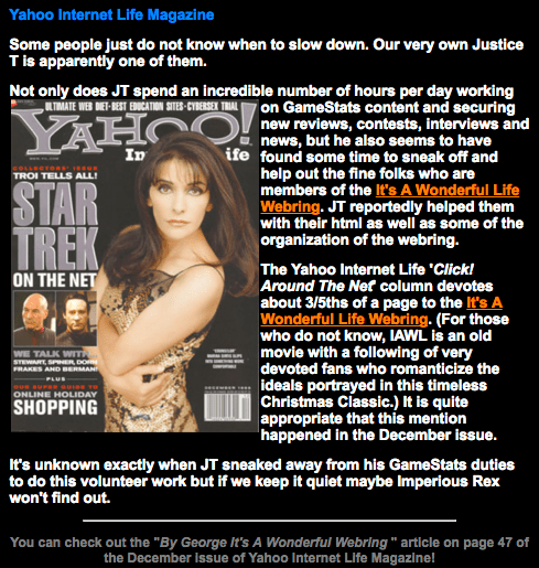 I was hired by Imperious Rex in late 1997 to relieve him of some of the day to day duties associated with the Gamestats Web Site. In the last 18 months my duties and responsibilities have expanded exponentially. I continue to bring to Gamestats a high level of interest and dedication having known, and been friends with, Imperious Rex for several years.