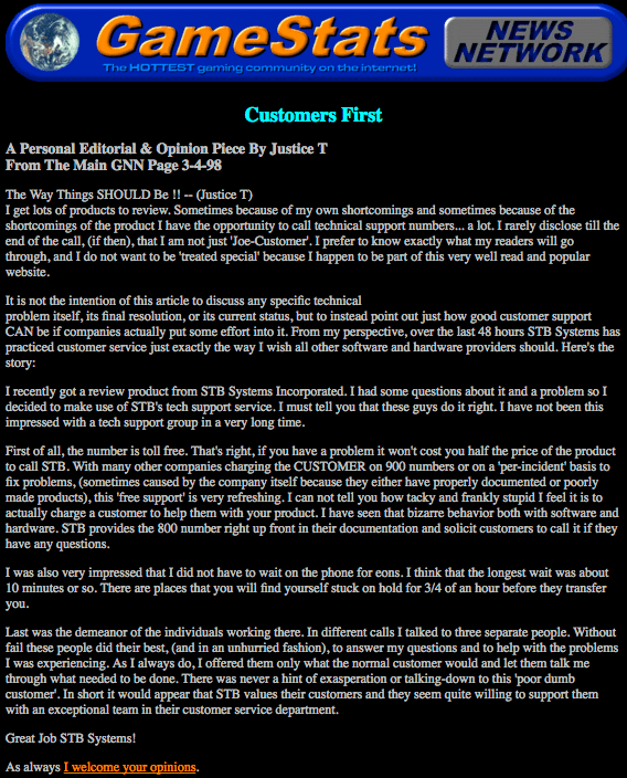 In order to assure a fair evaluation of products and to make sure that we did not misrepresent our motives we submitted the following conditions to all companies which were considered for product review. (These are the standard conditions under which ALL GameStats reviews are done.)