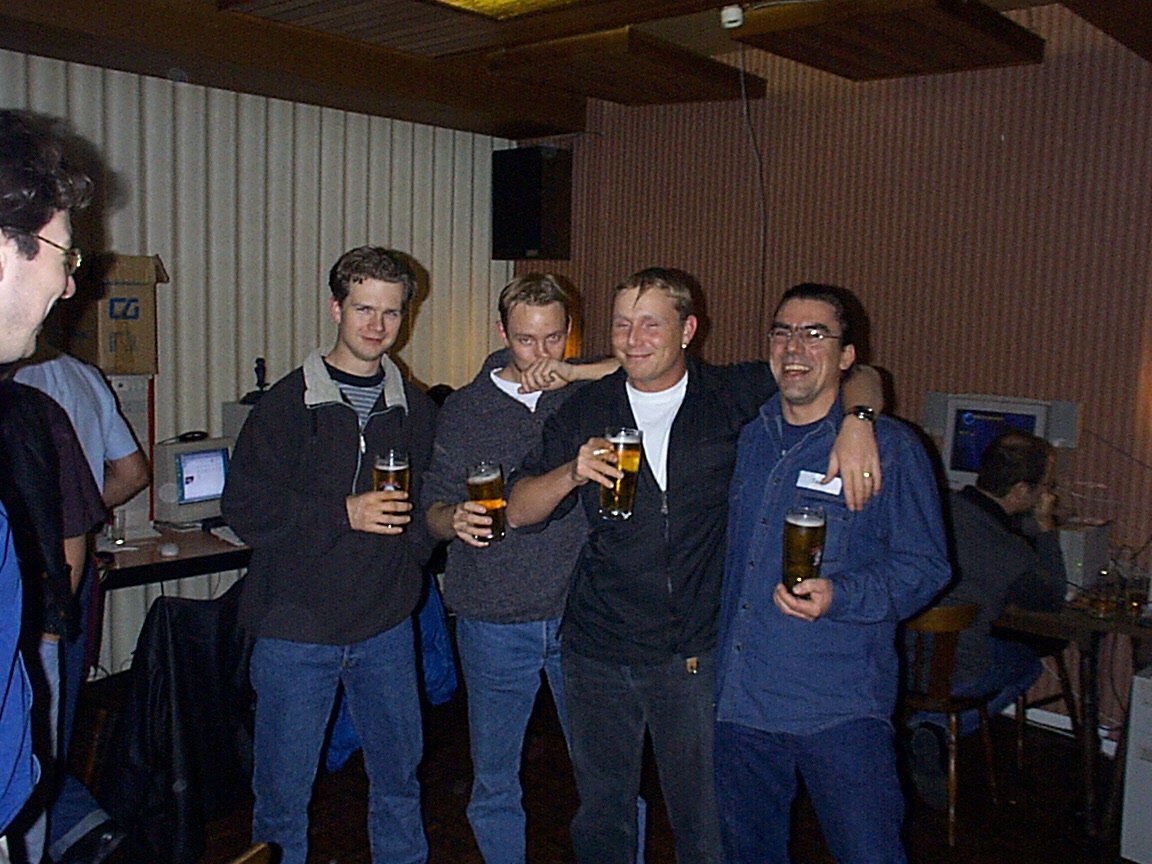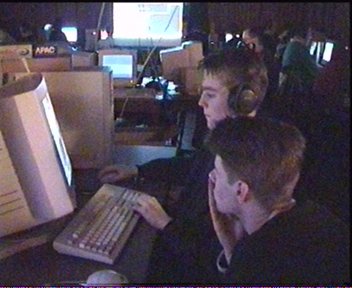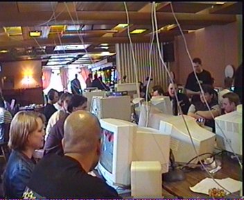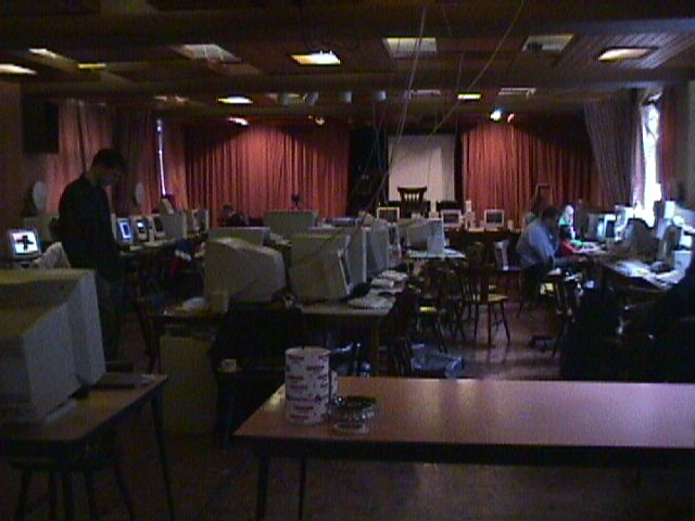 Zaterdag 10.30 uur ben ik met de wakkermaakronde begonnen …. ennu eh …. Jéézus wat kunnen mensen er anders uitzien ….s’ochtends als ze 4 uur te kort hebben geslapen…. (nee.. ik noem géén namen) …. rond 12.00 uur was echt weer iedereen volop bezig met ra, unreal, halflife en quake …. bijna nonstop tot zondagochtend 07.00 toen ging volgens de Hoteleigenaar de laatste diehard pitten. Cool dat bijna iedereen zijn headphone gebruikte en grappig als je toevallige hotelbezoekers verbijsterd op zag kijken als er in een vrij rustige zaal met 40 man supergeconcentreerd achter hun beeldscherm zittend een quaketeam in één keer keihard hoorde juichen om de zojuist gescoorde cap en het andere team hoorde vloeken om diezelfde verloren cap.