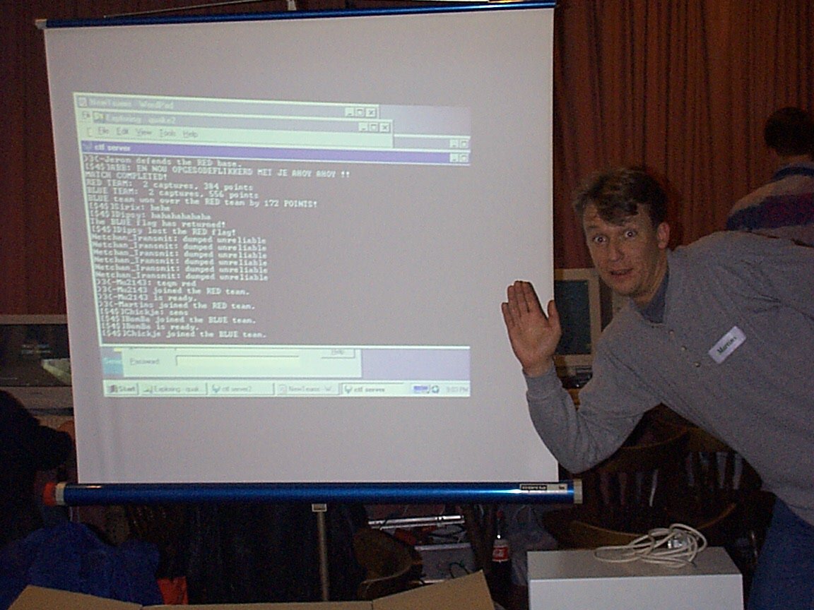 Red Arrow en chicken kwamen ook binnen, onze netwerkbeheerders. Zij beide hebben een prima taak vervult. Netwerk ging lekker soepel (wat wil je met van dat dure apparatuur) en chicken had de nodige Quake2 servers opgezet.