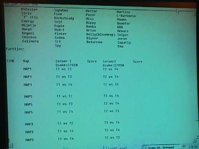 Quake2 team werden gevormd voor CTF2. “Team”leaders werden aangewezen. Zij waren Vector, Supercow, Calimero, Martins. Men had getost om te kijken wie er als eerste zou mogen kiezen. Teams werden uiteindelijk gekozen en naar mijn menig vrij eerlijk. Deze dag was meer een oefendag dus meer om de fun. Dat was meer omdat bepaalde mensen pas de volgende dag zouden komen.