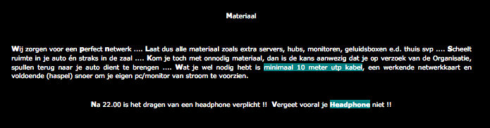 Vrijdag: Toegang vanaf 17.00 uur. Nadat je onder het genot van een soepje / kopje koffie bent bekomen van je zware reis, kun je je spullen opbouwen en je slaapplaats inrichten. Daarna kan o.a het BF42-gen, MoH-en, Rtcw-en, D2-en, Ra-en, Quaken, CSsen, leechen en natuurlijk het uitwisselen van kennis en ervaringen over van alles en nog wat, maar vooral op ict gebied beginnen. Rond 21.00 zal er een leuk en vooral lekker buffet klaar staan. Buiten huis eten is dus totaal overbodig ! Om 04.00 kappen we er mee en gaat de zaal dicht.