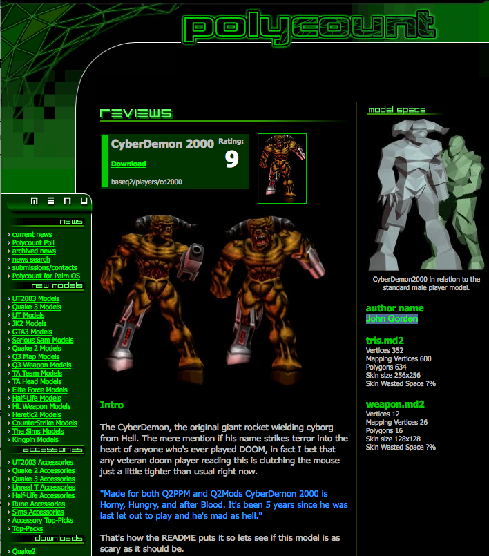 The model in general was good. The poly count was low enough for a decent game of Q2, and it looks just like the original guy. There were a few problems I noticed, however. No model is perfect ;). The head looks a bit boxy, if you ask me. The lower jaw is a perfect square, and the rest of the head looks “square-ish” as well. There is also some odd polygon meshing on the left and right sides of the torso, which makes the corners of the chest stick out unnaturally (then again… he is a half-cyborg). There could have been a few polygons saved here and there, such as the bottom of the feet or the mid-torso area. The CyberDemon model uses parts from other models (such as those arms… recognize ’em from anywhere?… try the original Quake 2 male model) but it’s hardly noticeable unless you read the read-me or you are a complete ppm-guru. The rest, otherwise, is great looking. Everything manages to stay in proportion with the original CyberDemon, except the head is a bit big. It has flaws, but small ones. I would recommend this is you were once a good DooM fan (or if you still are). This is a four star model. Bravo!