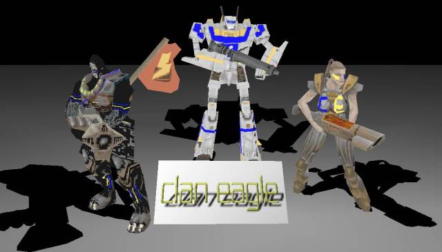 This pic was done with the Quake Scene Browser and show a couple of the clan’s skins on three models. Clan Eagle custom Male skins by Pilotz, Shadow and Trufyre. Female and Battroid skins by Lensman.