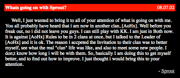 Well, I just wanted to bring it to all of your attention of what is going on with me. You all probably have heard that i am now in another clan, [AoHx]. Well before you freak out, no i did not leave you guys. I can still play with KK. I am just in Both now. It is against [AoHx] Rules to be in 2 clans at once, but I talked to the Leader of [AoHx] and it is ok. The reason i accpeted the Invitation to their clan was to better myself, see what the real “clan” life was like, and also to meet some new people. I don;t know how long i will be with them. So, basically I am doing this to get myself better, and to find out how to improve. I just thought i would bring this to your attention. -Sprout