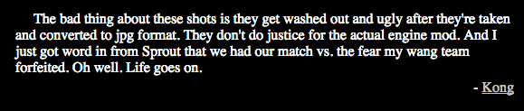 In other news, I will probably begin construction on KK Website version 2.0 (sounds catchy doesn’t it). I’m going for more of a technoish look. Some sites I’m thinking of making it look like are the Call of the Force, Railwarz, and clan GO! sites. If anyone has other sites they know of that might be a good influence for 2.0 then let me know. -Kong