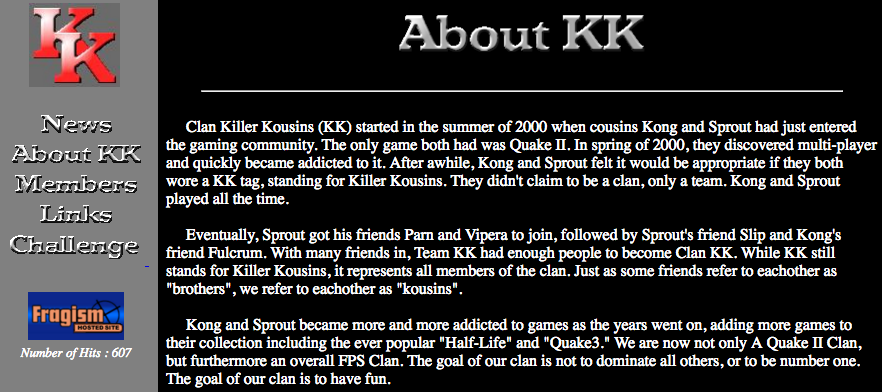 Clan Killer Kousins (KK) started in the summer of 2000 when cousins Kong and Sprout had just entered the gaming community. The only game both had was Quake II. In spring of 2000, they discovered multi-player and quickly became addicted to it. After awhile, Kong and Sprout felt it would be appropriate if they both wore a KK tag, standing for Killer Kousins. They didn’t claim to be a clan, only a team. Kong and Sprout played all the time.