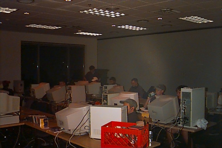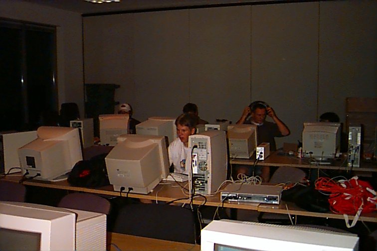 Kat was also there, but she didn’t play much. I got there at about 11:45 or so, after getting there the night before at about 11:00 and playing with Klippit, Princess, and Crankshaft till about 3:30. I was fortunately the first of the lanners to arive, because nobody here in the lan crowd had met John (Klippit) before (even though they had played the map he made – 2tiny2 – which is always a hit at a small lan party). With me I brought Mystikal, and Zenith and kEg were close behind us with 2 more rented tables. Docta was next with his machine full of cool stuff to “borrow” (*Cough*). NFS3 was a hit – by the way. I will buy it when it comes out. Then Enertia showed, and we all played for a long time. Lithium, CTF, Need For Speed 3, and Dune 2000 were all very popular games that were made use of. TankGirl showed up for a while and tried to get the joystick to work on my P233 machine. It never did, damnit.