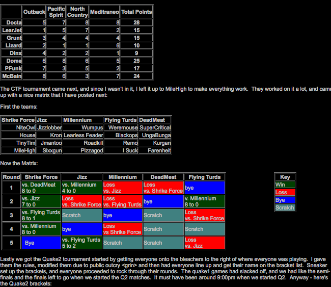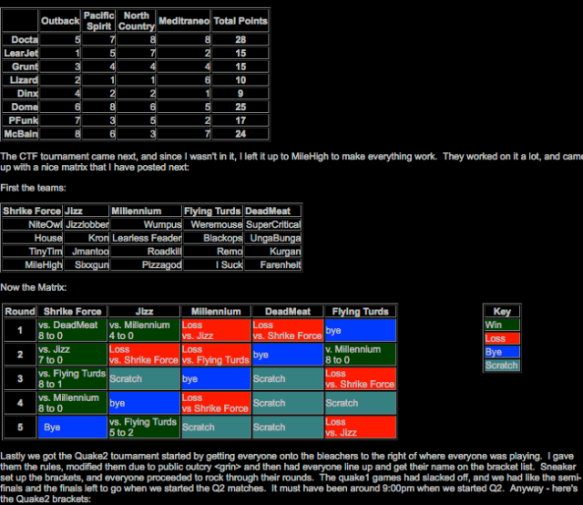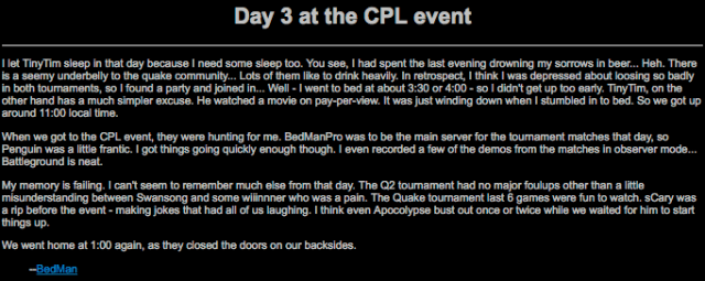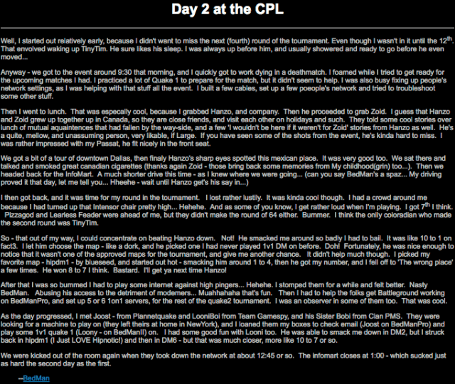 Day Three: We have some stuff to do today. Theres a few more rounds of the FFA that all of us need to do well in. There’s the MotorHead tournament – which Docta wants to win REALLY badly. John Carmack is due to give a seminar on something or other. Perhaps I’ll get to make another update later to tell you all what has happened. That’s all I got for now – I’m off to breakfast, my FFA round, and then a nap. Heh.