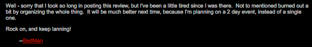 I post all reviews that are sent to me. If you want to see your name in lights – please send your review of a lan party in the state of Colorado to me