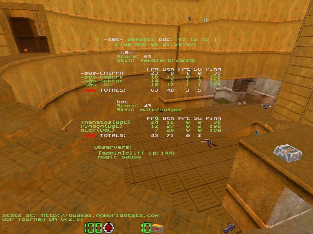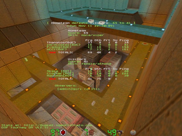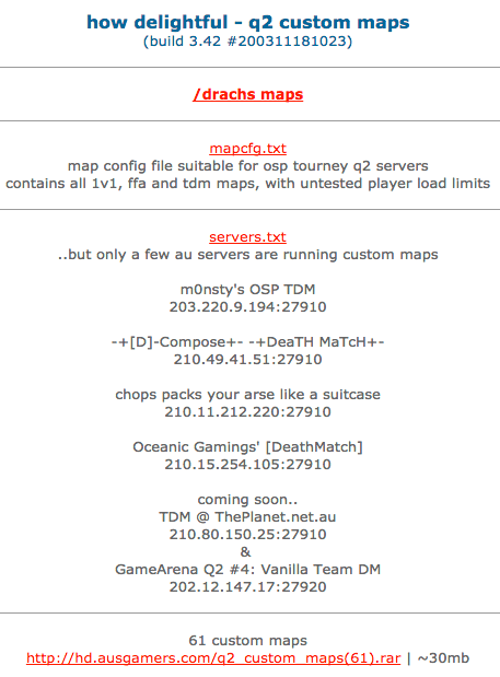 How delightful – more than 61 q2 custom maps suitable for osp tourney q2 servers. Contains all 1v1, ffa and tdm maps, with untested player load limits… but only a few Australian servers are running custom maps: m0nsty’s OSP TDM, -+[D]-Compose+- -+DeaTH MaTcH+-, chops packs your arse like a suitcase, Oceanic Gamings’ [DeathMatch], TDM @ ThePlanet.net.au, GameArena Q2 #4: Vanilla Team DM.