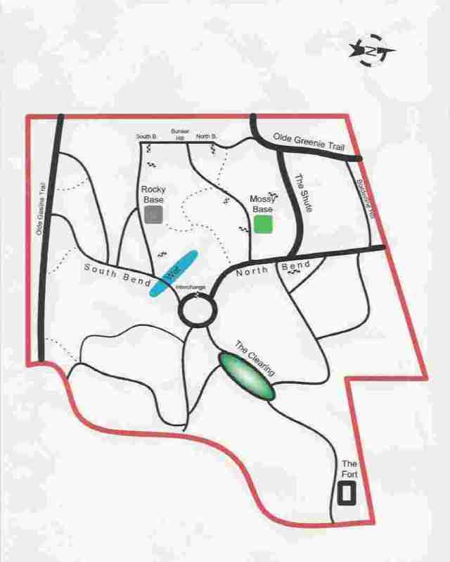 Shit. I’m really pinned down here. I call out to Jon to move up and help me. It sounds like he’s a long ways off but I yell that I’m pinned down. I just hope he understands. Peaking out, I can just see the edge of Erling’s jacket. I blast another 20 or so rounds at him but at least half are taken out by twigs and branches before they get there. He’s moving left and I move counterclockwise to the next cover, now he is southwest of me. Again I’m pinned down. There’s shots whizzing by me on both sides. We’re maybe 75 feet apart and he sprays ammo toward me again. When I next peek out I have a good view of him with less branches so I start spraying fire at him. Now Erling runs south and I see his flag, abandoned on the hillock. Probably never have a better chance so I run up the hill and grab the flag. Not dead yet. I run for the path back to the stream. I know Erling went southwest and I’m going southeast. My base is straight south from here.