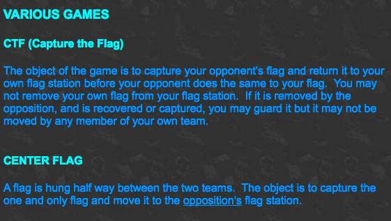 Schedule for upcoming events and signup area. Who won, who lost. Who lived, who died. Pictures of the site, people, guns, etc. Basic rules and some games we play. Forums for, Starcraft, Warcraft, Diablo, Paintball, Quake, and whatever.