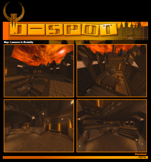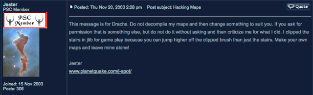 In 2003, Jester called out drachs for modding his map jlib “Lessons in Brutality” without permission: “This message is for Drachs. Do not decompile my maps and then change something to suit you. If you ask for permission that is something else, but do not do it without asking and then criticize me for what I did. I clipped the stairs in jlib for game play because you can jump higher off the clipped brush than just the stairs. Make your own maps and leave mine alone!”