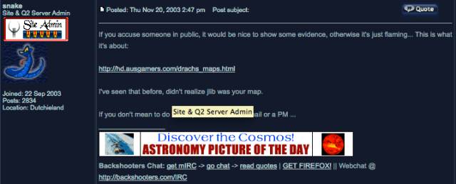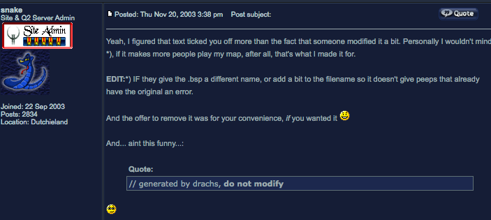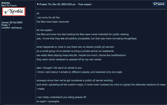 Drachs apologized: “What happened is, here in Australia there are no decent public q2 servers. So a small group of us started running a private server on weekends. We really liked playing maps like jlib, maybe too much, hence the modifications. They were never released or passed off as my own works. I can totally understand you being pissed off. So again I apologise.”