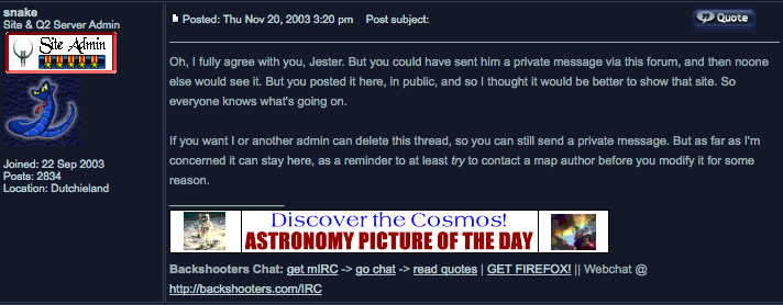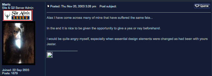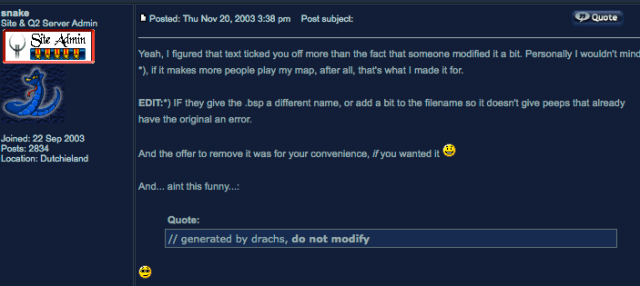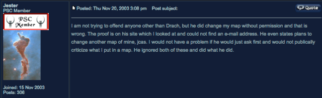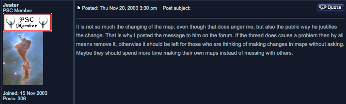 Jester replied: “Apology excepted Drach. I kinda thought that someone out there might mess with any maps I release to the public, seems like a risk you take. Asking permission would just make things a little easier. The thing that really causes problems is to insult someone elses work on your website. So as long as the what the f*** statement is removed, no hard feelings.”