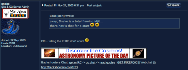 25:OCTOBER:2001 – drachs: Yawn, small updates here and there. Nothing major. A few small things are annoying me still. Might start to add something to the demo section today or tommorow or whenever. Oh and if I get really bored I think I’ll try and get the members age section to display real time ages accurate to the second 8) Wont that be hours of fun to sit and watch! Hopefuly there wont be too many more of these ‘site update’ updates..