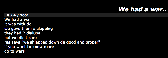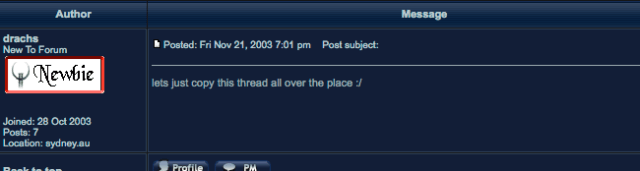 22:OCTOBER:2001 – drachs: Ok, this post is just to test how easy it is to update. Especially if theres going to be newbies screwing up my html >:|
