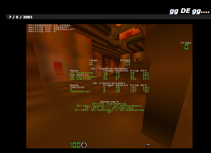 08:NOVEMBER:2001 – drachs: Well.. tel$tra are improving my adsl service (apparently, although its still going to be routed through melb!?) and charging more money for less (yay). A side effect of this is that they have decided to riddle the poor dsl service with a whole heap of packet loss. So i got bored the other night and started jumping up the jumpclimb maps. So, who wants a race? Those didnt take me very long to do and can easily be improved upon. Hours of fun for the whole family!