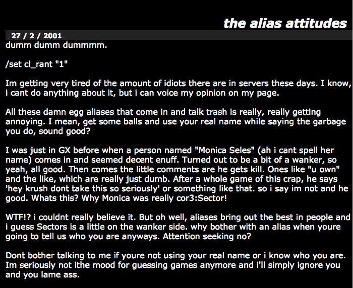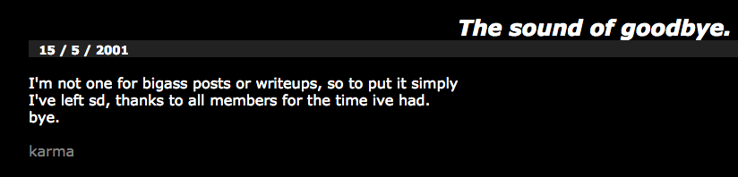 23:OCTOBER:2001 – drachs: I added colour to the site today! I think thats about as astheticly pleasing this site will get. Maybe some subtle flash additions to give it a little something. Hopefuly some semi-regular updates about general shit and some nice additions to the demo section will be enough to make this site almost worth being :)