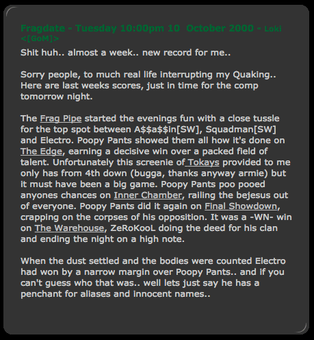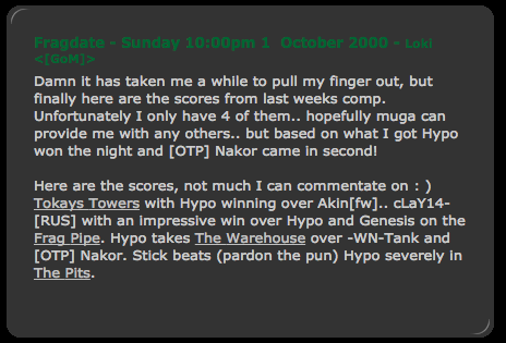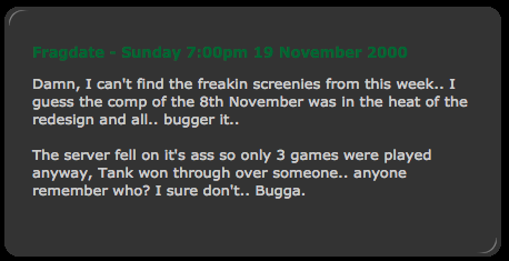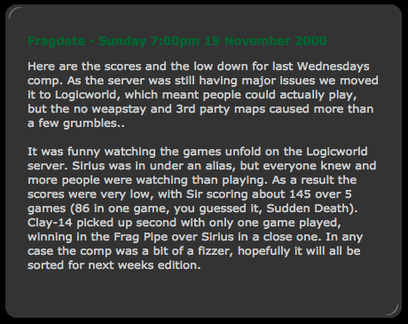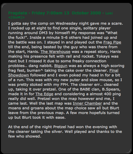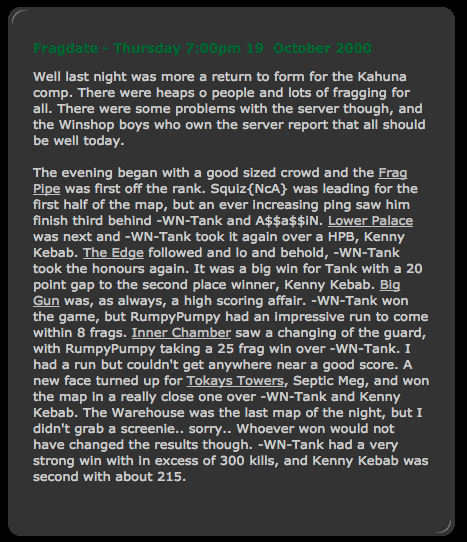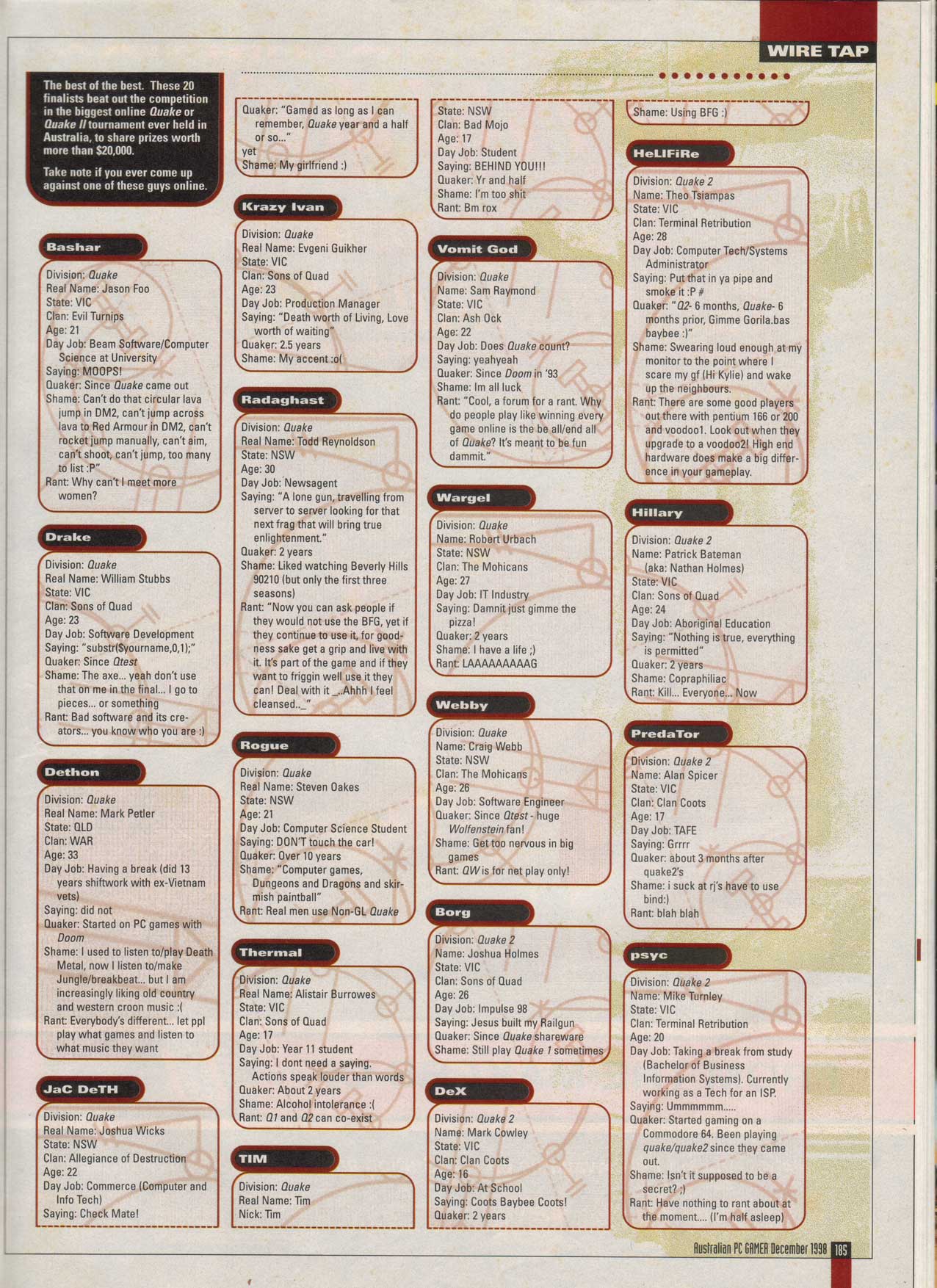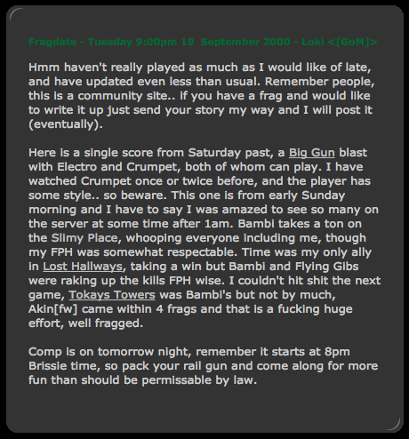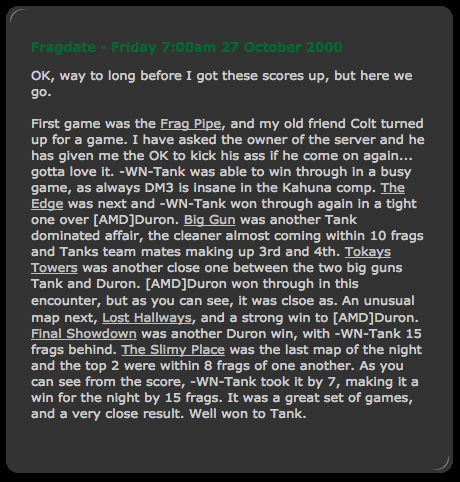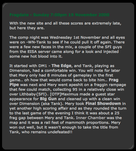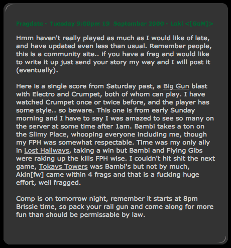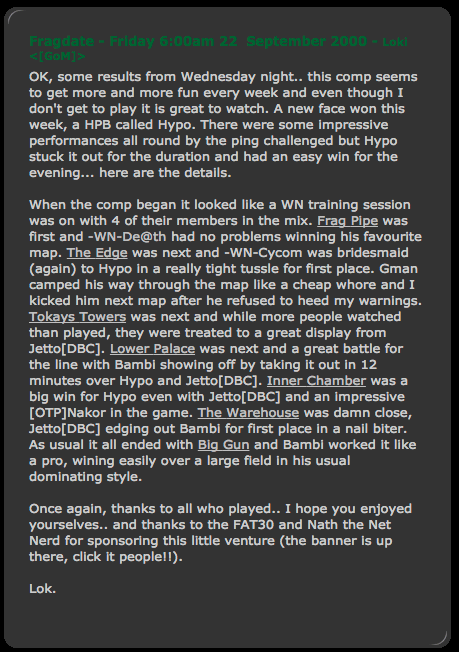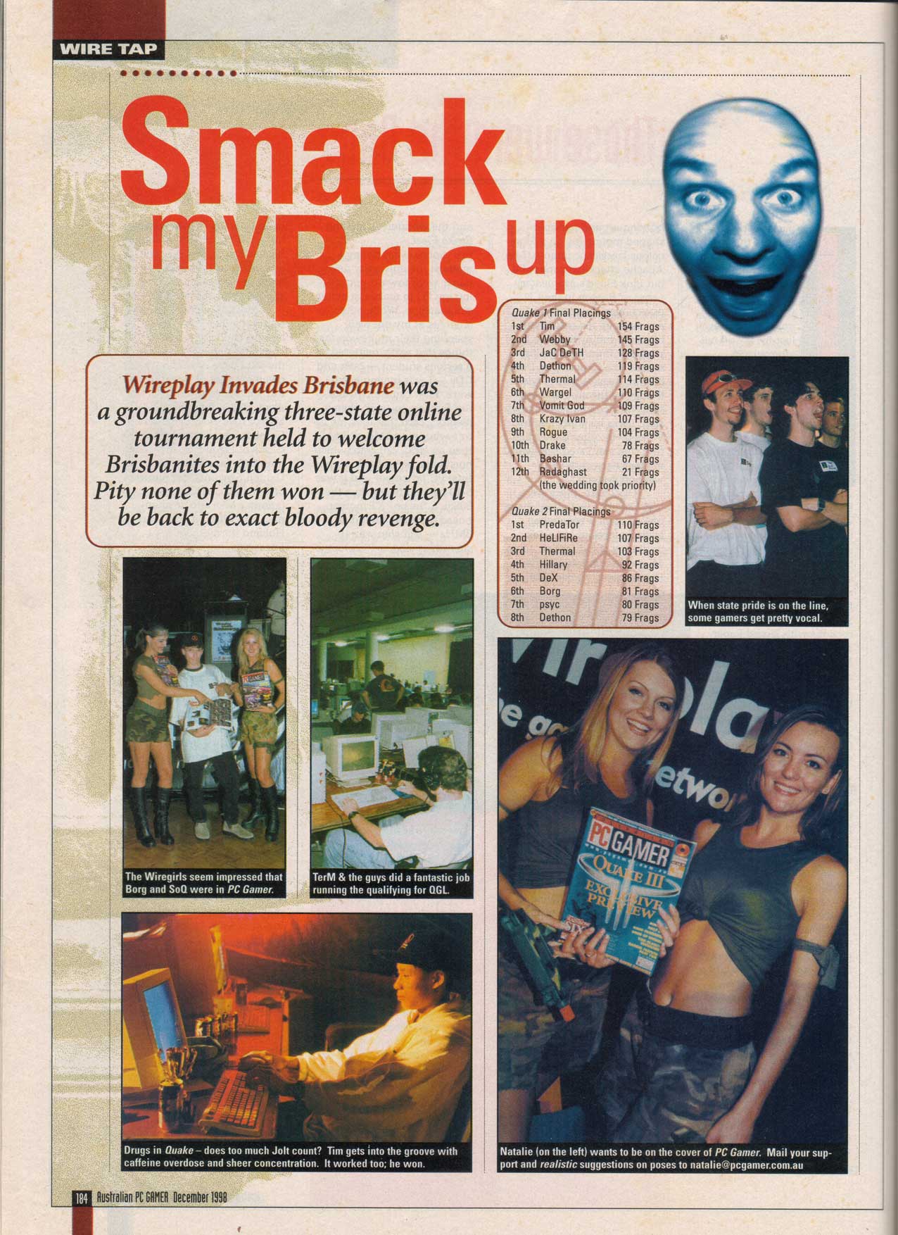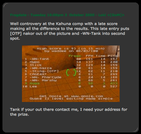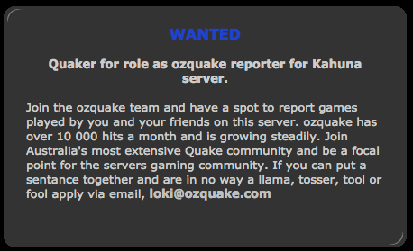 There is no denying that the online Quake III scene in Australia is strong, and growing stronger. Challenge-au are currently running a two player team ladder with 64 teams competing. Ozquake has received over 180 registrations from gamers interested in future online comps, and through alliances with Challenge-au, Games@EISA and ausgamers, ozquake hopes to keep Quake at the head of the pack when it comes down to make gaming online attractive to big business. It’s a new direction for sponsors, but one that has it’s advantages in terms of audience and continuity. I truly believe that as broadband internet becomes the norm online gaming will rival LAN’s in terms of numbers and prizes. It’s the future of gaming, it is simply evolution baby.