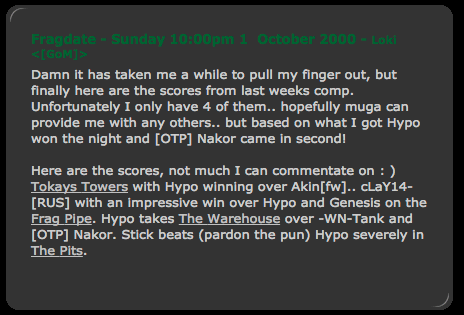 “Thanks to organizations and sponsers like the CPL, Ozquake and AMD, australia is now starting to provide seriouse prizes and money for doing somthing you already do. Don’t believe me? Perhaps you’d like to come listen to my new Nomad Jukebox from and online compeition run by Ozquake (over $1000) or hop down to the $10,000(US) tournement on in Melbourne at the end of march. I know I will :)
