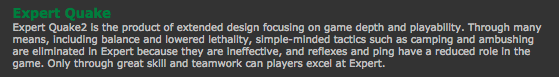 So whats the story, why does everyone love it? They say its good because it requires skillfull aiming? Pff, the 1 room custom map I made needs more aiming than that piece of sh*t. Q2dm1 is fluke city, it bores the hell out of me and makes me groan when I see it being put up for vote. You don’t even need to move your mouse in it. Just run/hook from ya spawn to the main battle area and start strafing from side to side, soon as someone pops into ya crosshair – ZAP, dead meat. I am sure it is a great map for GX, DM and lithium but in instagib it does NOT cut the mustard. Why not play a great hallway map like q2dm6? Maybe even the hooky staircase; q2dm7? Maybe even go so far and get spastic on dm2 tokay’s towers? All those maps require much more strategy and skill than that… disgusting excuse for a map. Why am I against this map? Boredom! I have played dm1 uncountable times, and frankly the next time I have to play it, I will probably puke all over my key-board. Anything has to be better than dm1! Go download some REAL maps.