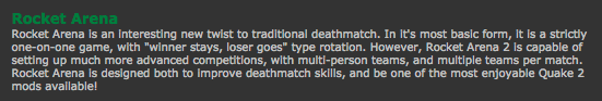Lithium, Death Match, Action Quake and Capture the Flag are also still being played, but no where near their hey day.