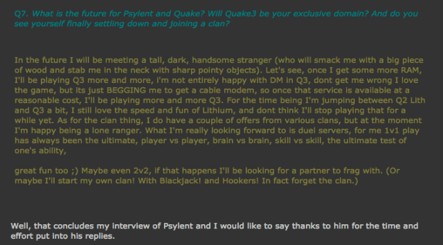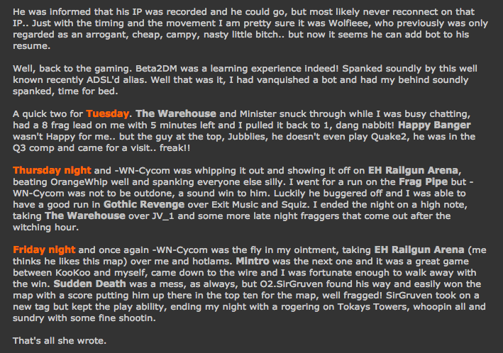 Q3 games included RA3, CTF, TEAM DM, FFA, INSTAGIB, plus a few others that only small groups of followers got into. AND YES there was a Q1 server up for a blink of and eye, I think I even heard that someone was playing Q2 but in my opinion I think they must have accidently clicked an OLD DISUSED link HIDING right next to the Q3 shortcut <hehe>