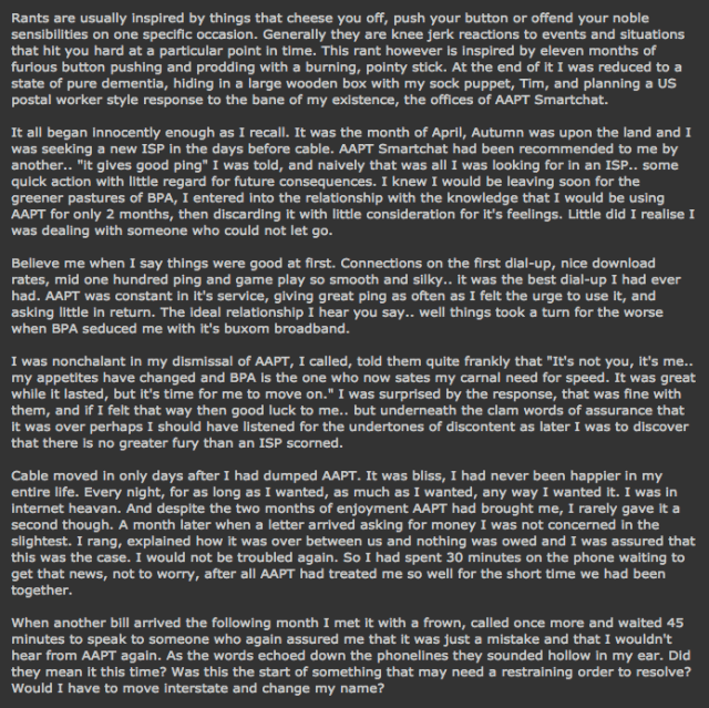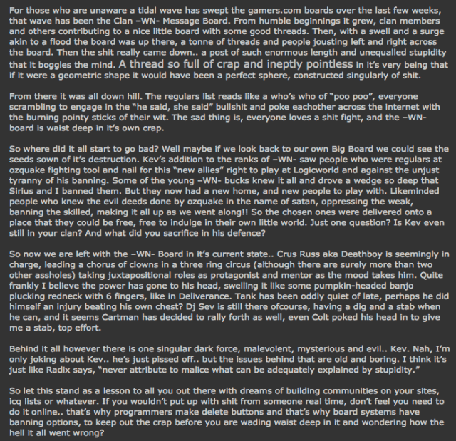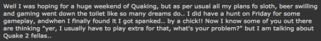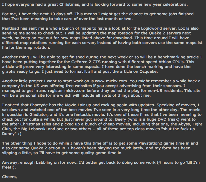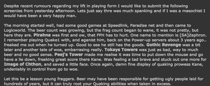 Hey there fellow quakers, this is my first post on ozquake and might I add it is such an honour to get the chance. When loki told me I could do a rant I almost soiled my self with excitement. So, most of you wondering who I am; I am logical, a q2 player from NZ. In quake2 I wear the tag aVT.SpastiX. So most of you are thinking; Who’s this sheep shagger and what does he have to say. In response to that; I have never made love to a sheep (or any other farm animal) and I never intend to. Second answer; I will try and say as much as I can say as much as I can. Thanks for reading. I will be posting my first official rant tommorow 30th of april 2001, See ya then.