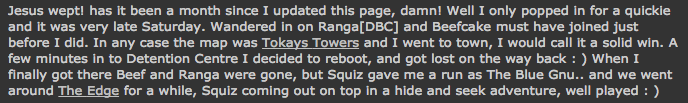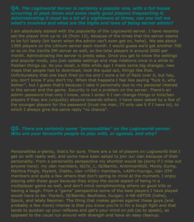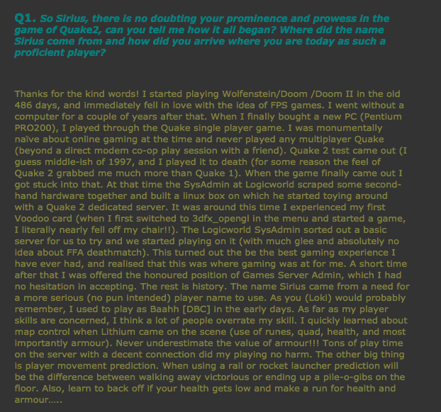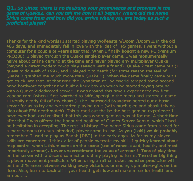 First cab off the rank is Sirius [DBC], undeniably a core component of the Logicworld server. Who could forget that game? It is certainly a claim to fame!! I asked him afew questions about his gameplay and his role in Q2 and here is what he had to say…