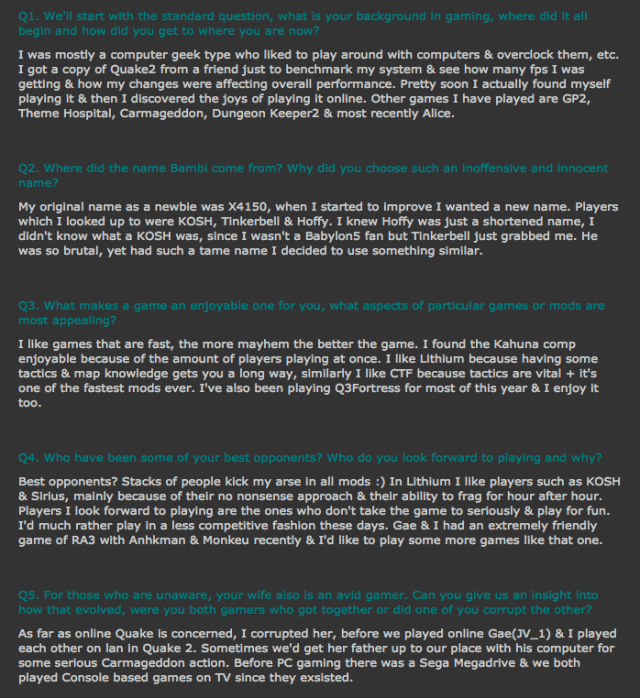 Thanks to Bambi for agreeing to this interview. Bambi has been gaming for many years and is one of the most respected and feared players around. Still a Quake2 legend, Bambi has now taken his talents to Quake III Arena and is making his presence felt in a whole new ball game. Now known as Fester of the McNasty Clan, Bambi still epitomizes the skill and attitude of the quintessential Quaker.