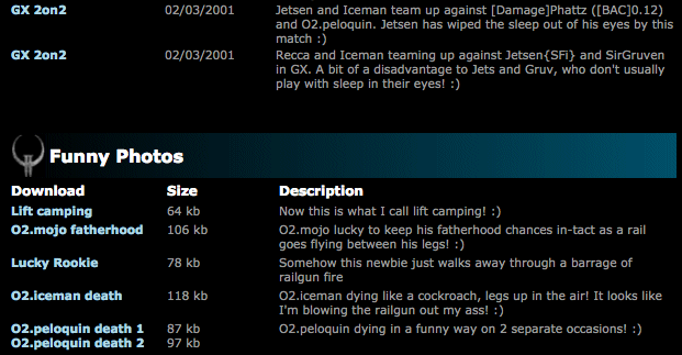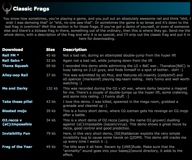 You know how sometimes, you’re playing a game, and you pull out an absolutely awesome rail and think “shit, I wish I was demoing that” or “shit, no-one saw that”. Or sometimes the game is so tense and it’s down to the last frag in overtime? Well this section is for those frags. If you’ve got a demo of yourself, or even of someone else and there’s a kickass frag in there, something out of the ordinary, then this is where they go. Send me the whole demo, with a description of the frag and why it is so special, and I’ll snip out the classic frag and put it in here for downloading.