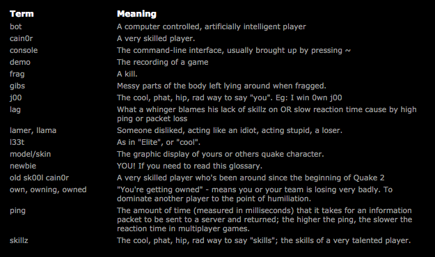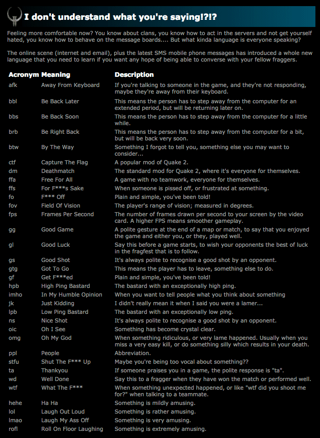 Feeling more comfortable now? You know about clans, you know how to act in the servers and not get yourself hated, you know how to behave on the message boards…. But what kinda language is everyone speaking? The online scene (internet and email), plus the latest SMS mobile phone messages has introduced a whole new language that you need to learn if you want any hope of being able to converse with your fellow fraggers.