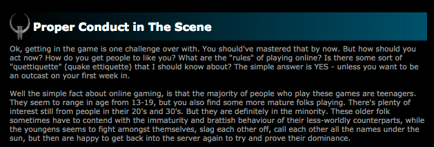 Ok, getting in the game is one challenge over with. You should’ve mastered that by now. But how should you act now? How do you get people to like you? What are the “rules” of playing online? Is there some sort of “quettiquette” (quake ettiquette) that I should know about? The simple answer is YES – unless you want to be an outcast on your first week in.