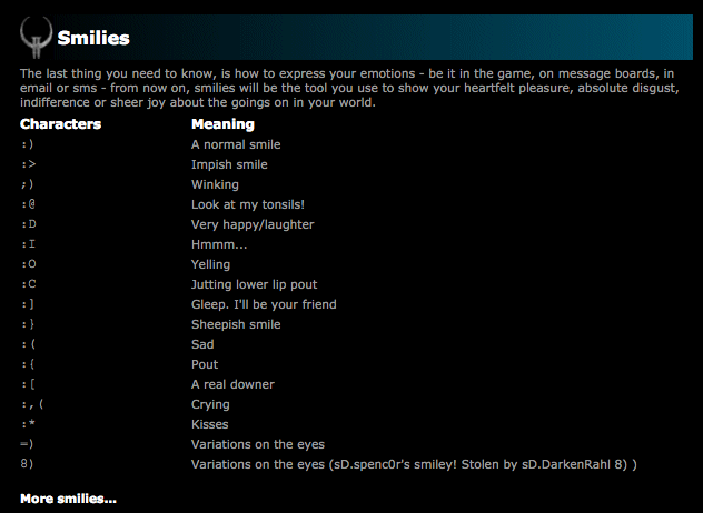 The last thing you need to know, is how to express your emotions – be it in the game, on message boards, in email or sms – from now on, smilies will be the tool you use to show your heartfelt pleasure, absolute disgust, indifference or sheer joy about the goings on in your world.