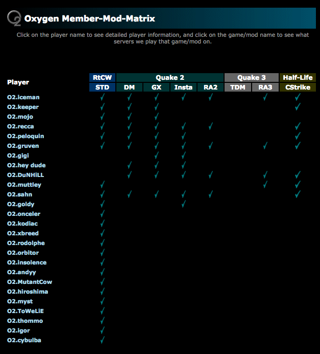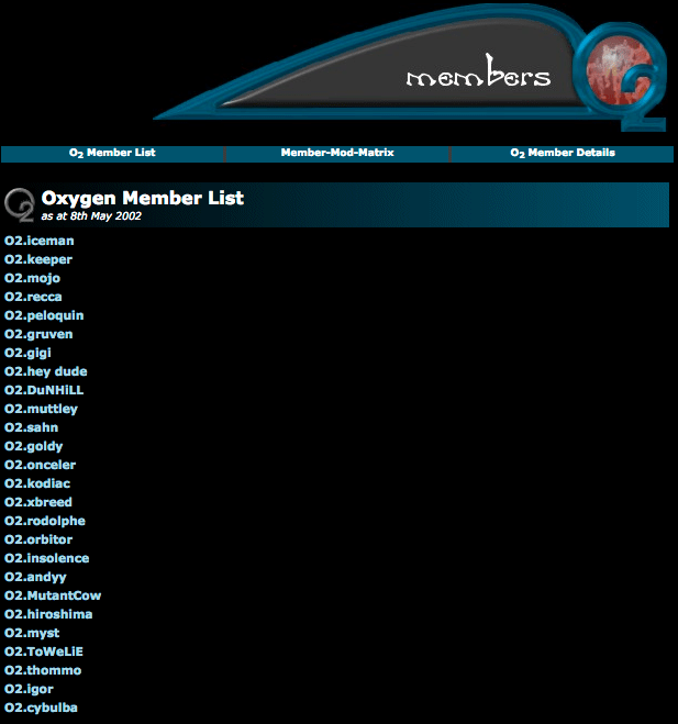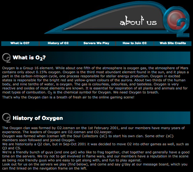 he Oxygen clan was formed by O2.iceman on the 1st February 2001, and our members have many years of experience. The leaders of Oxygen are O2.iceman and O2.keeper. Oxygen was formed when Iceman left the Soul Collectors {sC} to start his own clan. Some other {sC} members soon followed and joined Oxygen. We are historically a Q2 clan, but in Sep-Oct 2001 it was decided to move O2 into other games as well, such as Q3 and CS. We’re a friendly bunch of guys (and one gal) who like to frag together, chat together and generally have a good time on the servers. We try not to get involved in flame wars, and our members have a reputation in the scene as being nice friendly guys who are easy to get along with, and fun to play against. Look out for us on the servers we play (find below), and come and say g’day at our message board, which you can find linked on the navigation frame on the left.