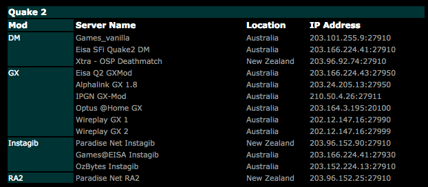 Well once you’ve installed Quake 2, you need to find yourself a server query program like GameSpy or Server Query. These programs find the servers for you, and you can filter them by connection speed, mod, etc. Find some local servers that give you the best connections that are running the mod you like to play, and away you go! For a list of the servers that O2 members play on, check out the about us page.