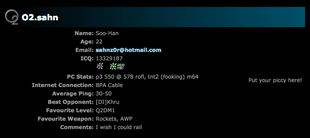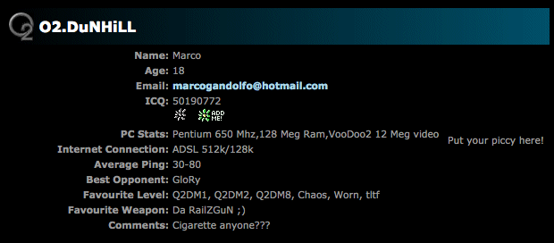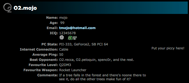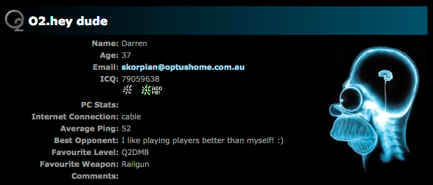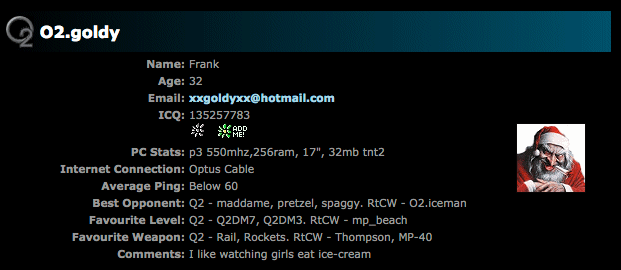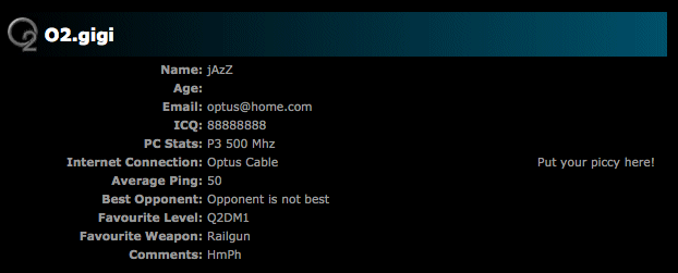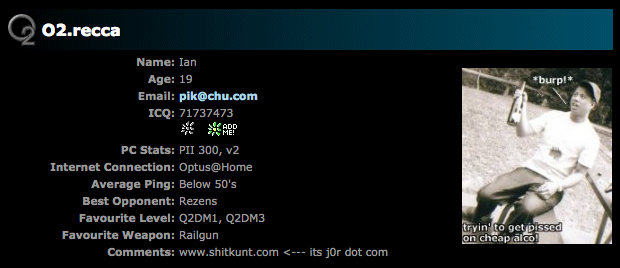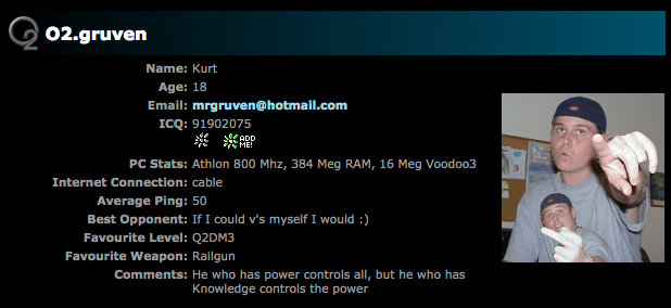 The online quake scene, in its simplest form, is a bunch of people who all like playing the same game against each other (or with each other) over the internet. Multiplayer games started on LAN’s, where people get a bunch of computers in the same room, hook them all up and play against each other. With the introduction of the internet, the online scene is sort of like a LAN, but millions of times bigger. The internet has allowed us to play on games servers against other people across the city, state, country, and hell, even across the other side of the world.