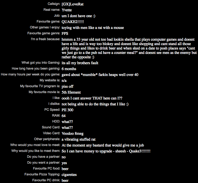 Bitchy: The Quake Mobile (Guzz’s car) has gone missing…yes, it was stolen 2 days ago…you wouldn’t have anything to do with that would you? :P And if not, what would you say to the thieves who obviously have no respect for Quake or idsoftware, if you found them?