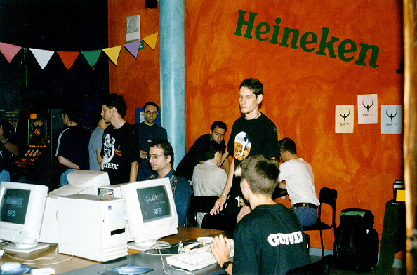 La mattina di domenica siamo arrivati al Virtual Pub dopo aver affrontato la fetentissima autostrada per La Spezia tra canti gregoriani di bestemmie. Abbiamo finalmente conosciuto di persona Petrini e compari, ci siamo tirati fuori dalle tasche mouse, floppy e tappetini, Tazzoni ha sistemato accanto al computer la foto di suo figlio (nato due settimane fa, soprannominato Giancacodemone). Alcuni tavoli erano gia’ pieni di gente, che in molti casi giocava quasi in continuazione dal giorno prima. Molti giocatori avevano ormai l’immagine del lanciamissili impressa al contrario nella retina. Noi, freschi come roselline, abbiamo lanciato un po’ di server qua e la’ e ci siamo massacrati a casaccio per le prime due-tre ore.