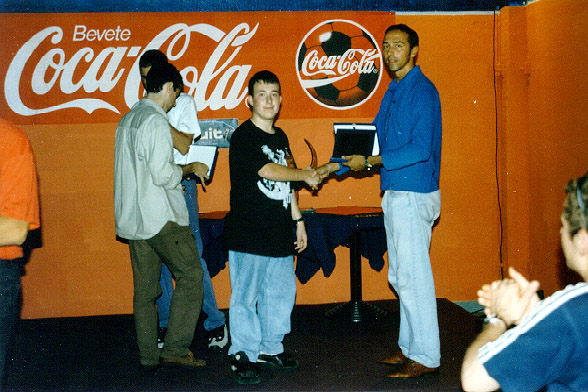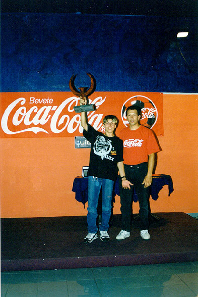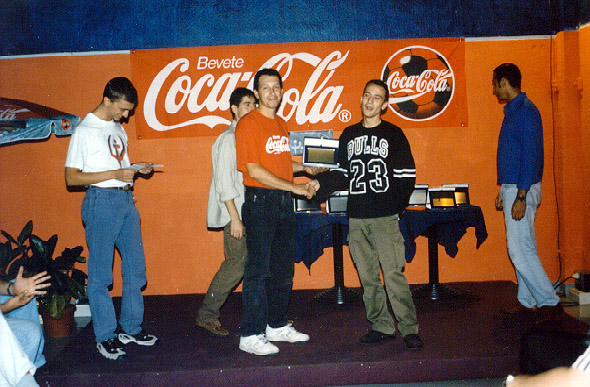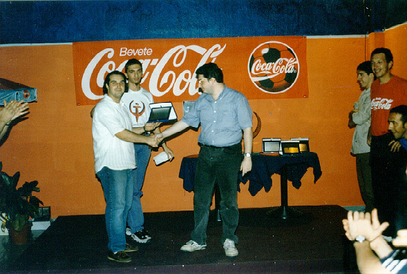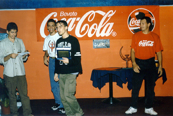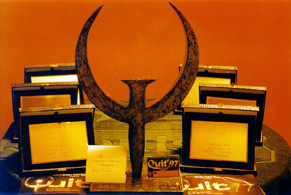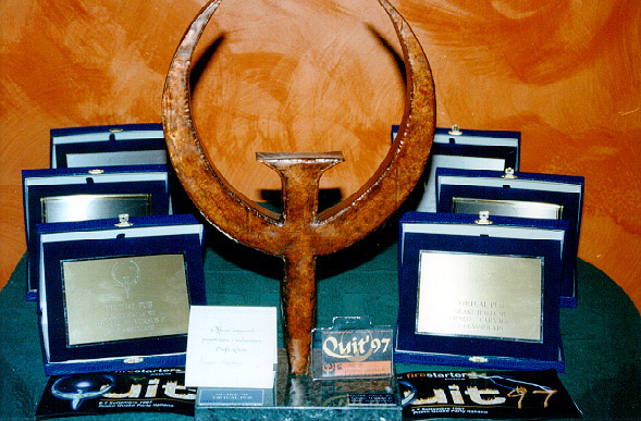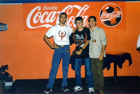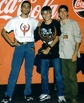 Ed eccoci qui a ringraziare, tanto per concludere.Con chi cominciare? Innanzitutto grazie ai gestori del Virtual Pub, che si sono dimostrati disponibili e tenaci nell’ affrontare la bellezza di 33 ora in balia di noialtri (che č tutto dire). Grazie a voi tutti, eccheccavoli! Se non ci foste stati voi… non ci sarebbe stato il Quit’97. Grazie, inoltre, a tutti i nostri amici, sia miei che di Paolo, che ci hanno dato supporto sia morale che pratico nell’ organizzare la manifestazione. Dovuti ringraziamenti anche alla C.D. Hardware della Spezia e del titolare Marco Venturini, che ci hanno supportato per la parte tecnica della cosa. Per rimanere in ambito tecnico, grazie ad Hammer degli IT che ci ha dotato di una gran macchina Pentium Based che ha tenuto in mano la gestione sia dei server Quake Word sia al controllo delle ranking durante il carnage. E, last but non least, grazie a chi senza chiederci una lira per il disturbo, ci ha fornito del pių bel trofeo che abbia mai visto. Eccolo, il trofeo, in mano al Campione d’ Italia Guyver, lo vedete in foto stretto in abbraccio, con il premio in mano, tra Paolo e me. Grazie, quindi a tutti coloro che ho qui sopracitarto e a tutti quelli che, mannaggia a me, mi sono dimenticato.