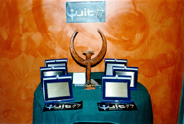 Sembra una banalita’, ma vale la pena di notare che seguire una partita di torneo dal vivo, quando ancora non si conosce il risultato, con la gente che osserva tesissima e magari applaude spontaneamente i frag piu’ spettacolari, e’ davvero un altro pianeta rispetto ad una banale demo. Secondo me sarebbe valsa la pena di venire al Quit anche solo per fare da spettatori.